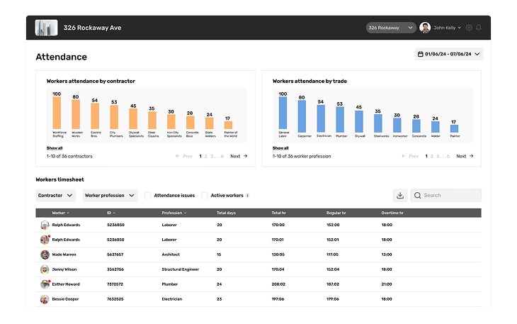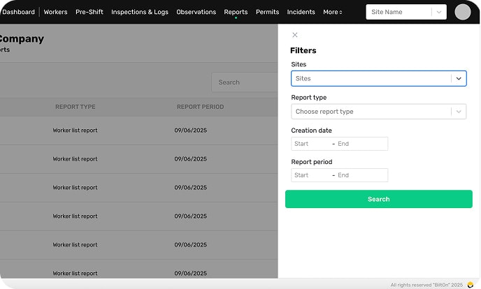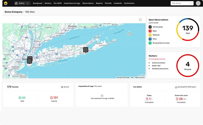 Live dashboards roll up headcount, permits, and incidents across every site. Executives, supers, and crews all work from the same live data – no exports required.